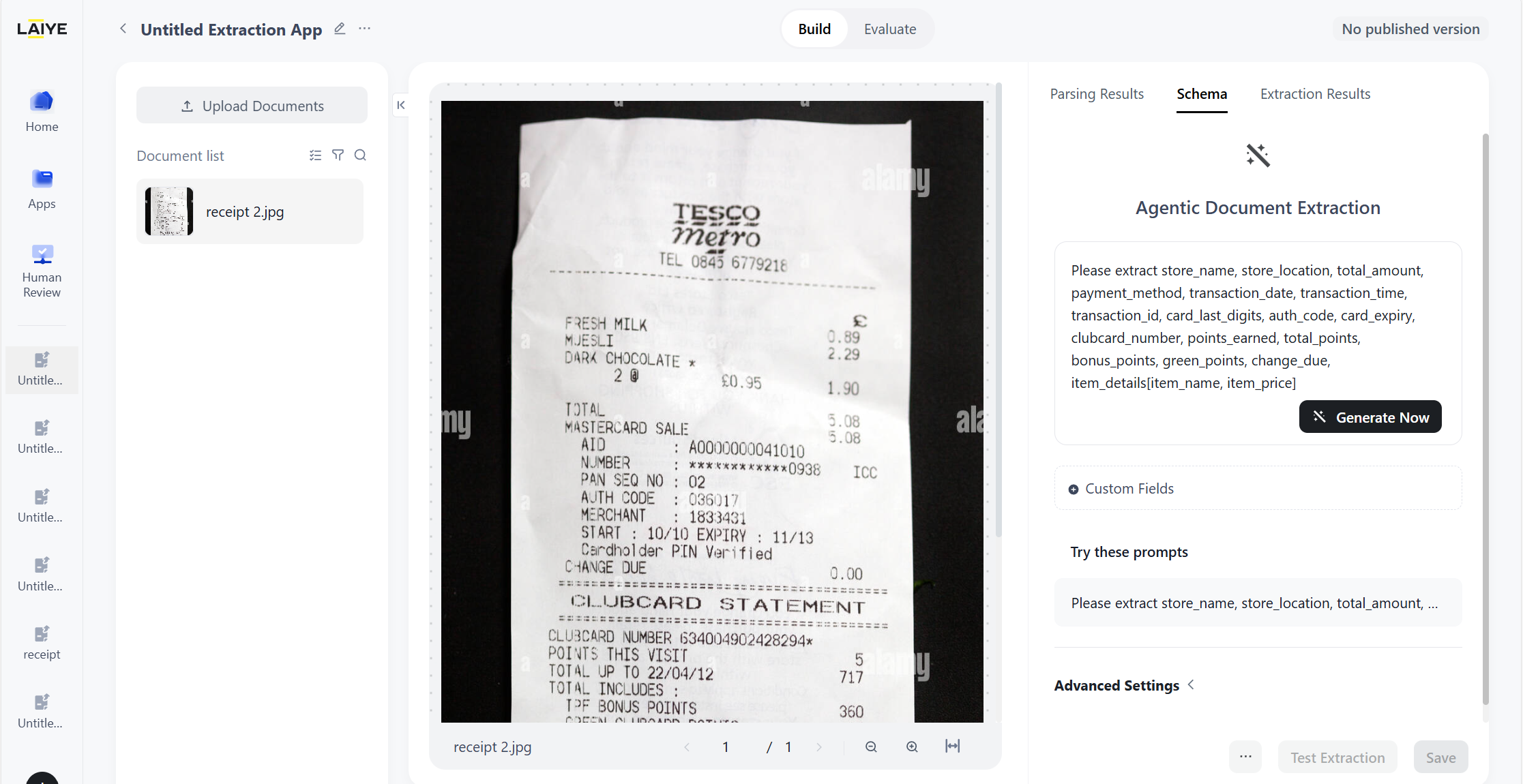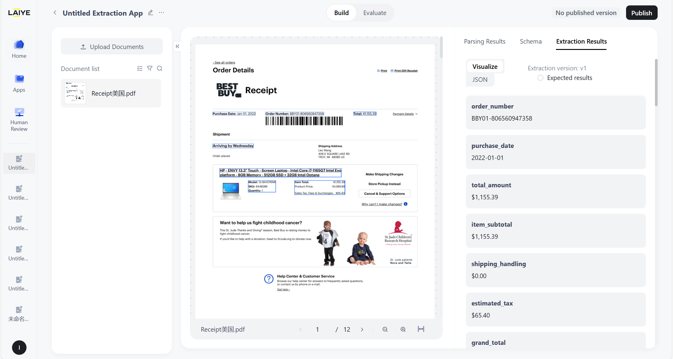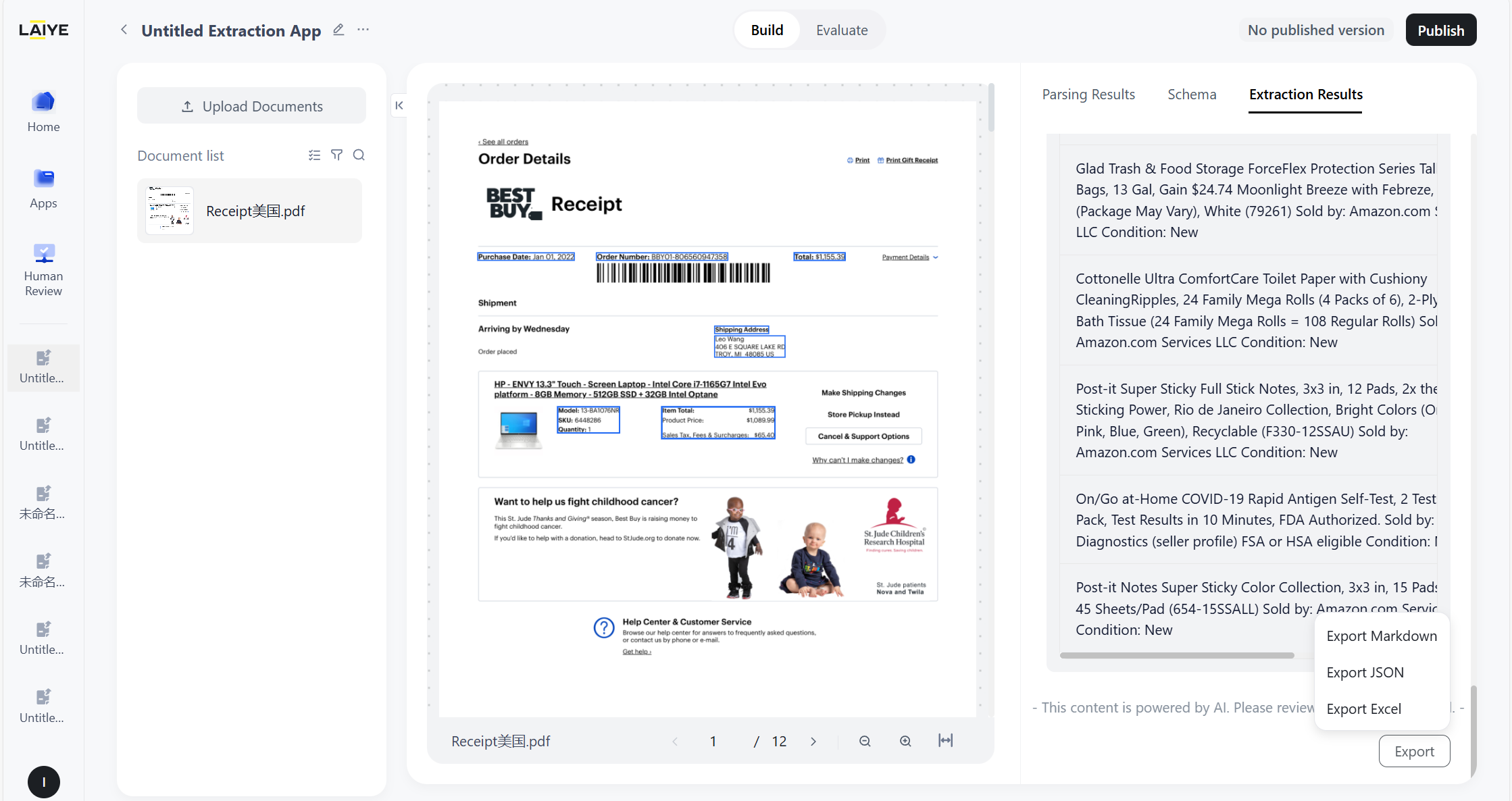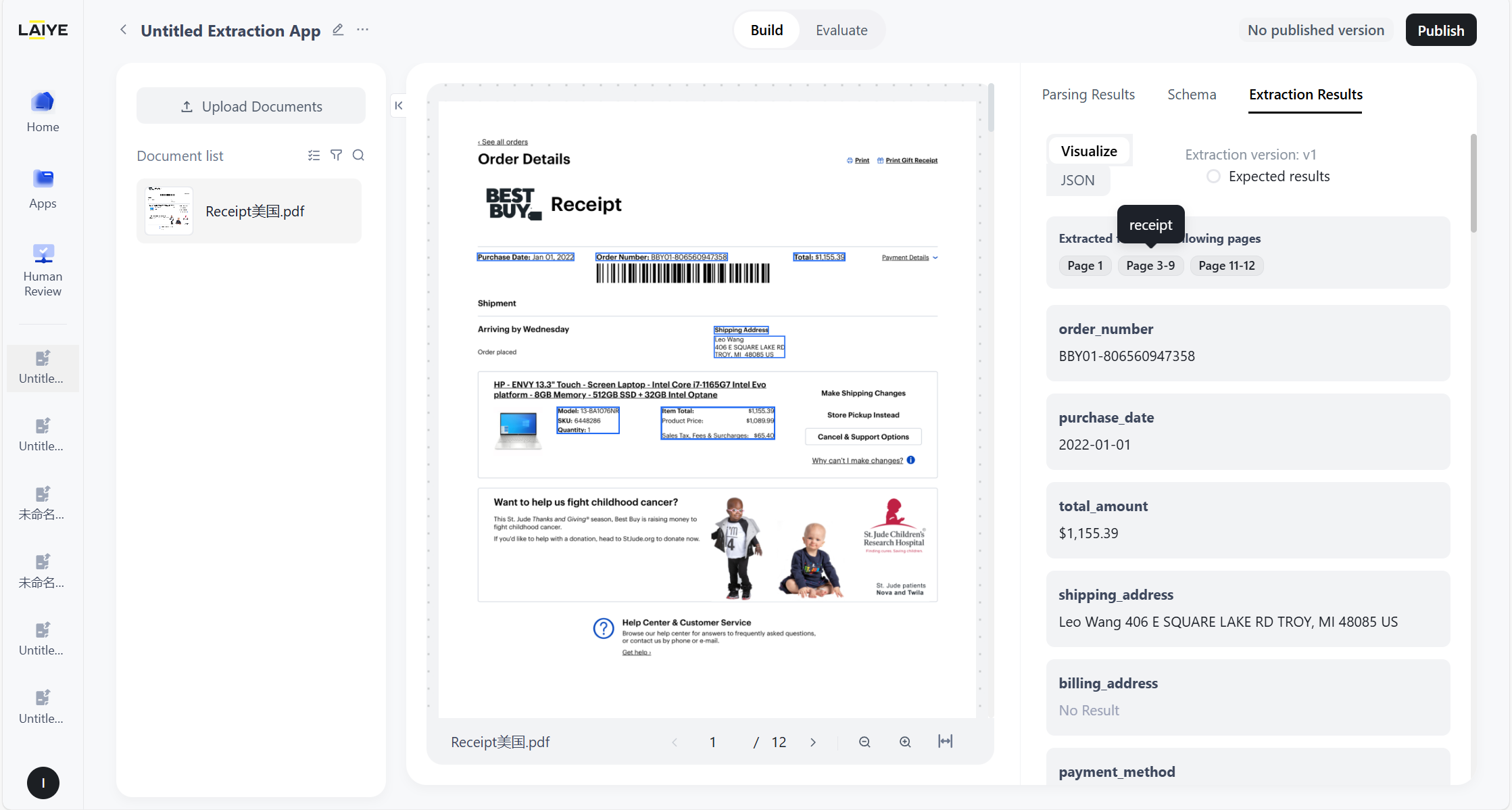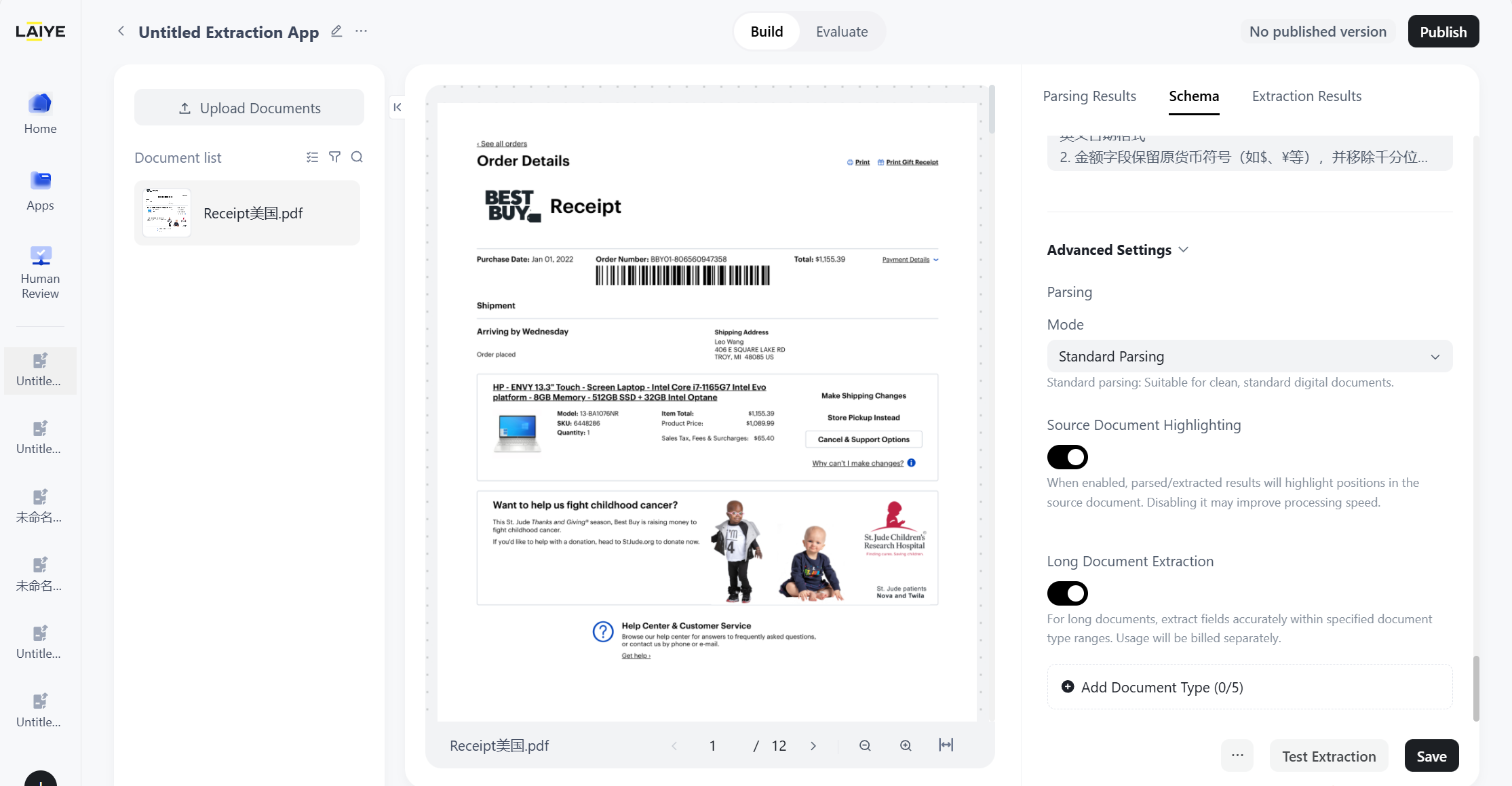 - Broad Support, Comprehensive Coverage: Both Document Extraction App and Out-of-the-Box features can automatically generate highly accurate extraction fields. The product is widely applicable to various general documents (e.g., invoices/receipts, purchase orders, procurement contracts), as well as specialized document types in finance (e.g., performance report), logistics and transportation (e.g., Bill of Landing, Packing List), and import/export trade.