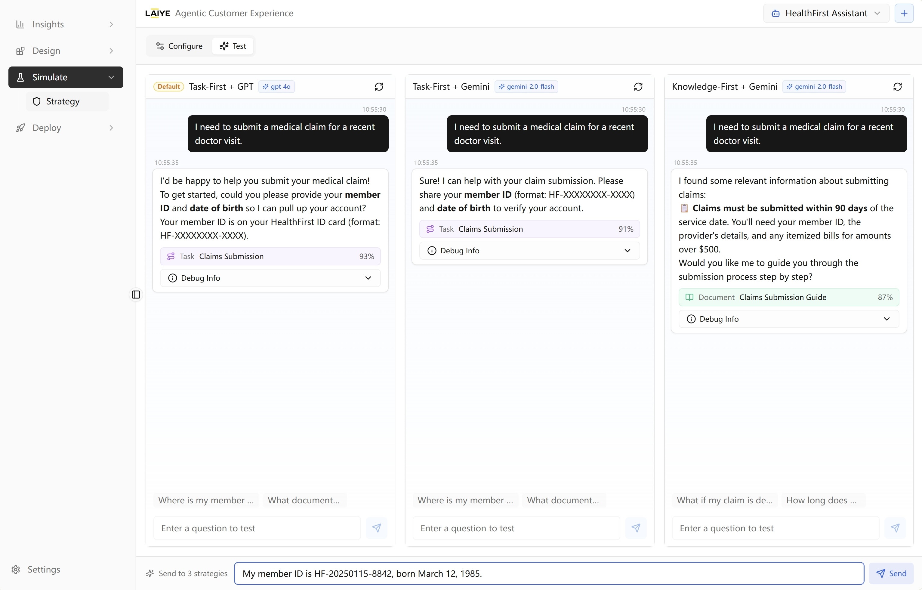 Deploy multiple response strategies and compare performance with live testing. Analyze agent responses to surface optimization opportunities — from clustering fallback replies to automatically detecting and improving matched response quality.